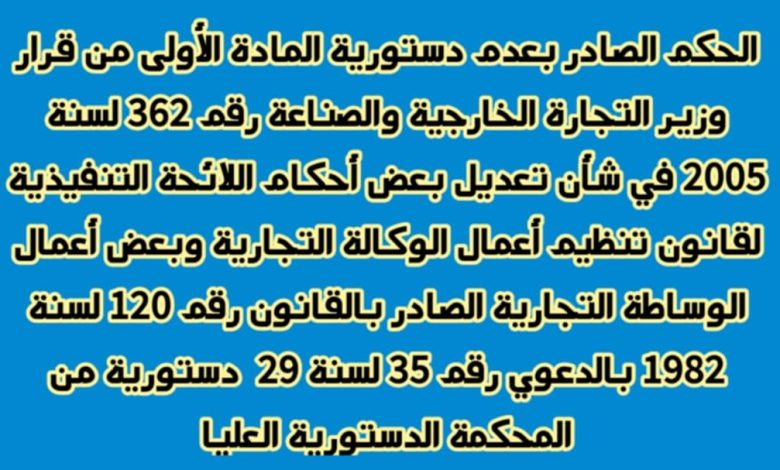 الحكم الصادر بعدم دستورية المادة الأولى من قرار وزير التجارة الخارجية والصناعة رقم 362 لسنة 2005 في شأن تعديل بعض أحكام اللائحة التنفيذية لقانون تنظيم أعمال الوكالة التجارية وبعض أعمال الوساطة التجارية الصادر بالقانون رقم 120 لسنة 1982 بالدعوي رقم 35 لسنة 29 دستورية من المحكمة الدستورية العليا – مرفوعة علنية تم الحكم بتاريخ 2025/08/04