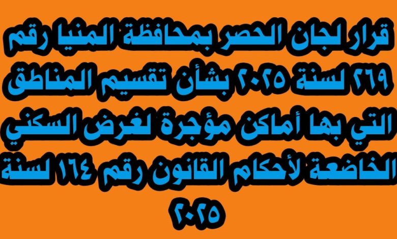 قرار لجان الحصر بمحافظة المنيا رقم 269 لسنة 2025 بشأن تقسيم المناطق التي بها أماكن مؤجرة لغرض السكني الخاضعة لأحكام القانون رقم ١٦٤ لسنة ٢٠٢٥