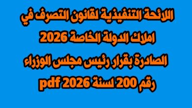 اللائحة التنفيذية لقانون التصرف في املاك الدولة الخاصة 2026 pdf قرار رئيس مجلس الوزراء رقم 200 لسنة 2026 pdf – اللائحة التنفيذية لقانون أملاك الدولة – اللائحة التنفيذية للقانون ١٦٨ لسنة ٢٠٢٥ pdf اللائحة التنفيذية لقانون ١٦٨ لسنة ٢٠٢٥- قانون تقنين وضع اليد الجديد – تقنين وضع اليد على الأراضي الصحراويةنموذج طلب تقنين وضع اليد – قانون أملاك الدولة المصري PDF – آخر أخبار تقنين وضع اليد 2026 – رسميا فتح باب تقنين وضع اليد علي اراضي الدولة 2026