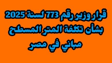 القرار الوزاري رقم 773 لسنة 2025 بشأن تقدير القيمة المتوسطة لتكاليف إنشاء المتر المسطح من المباني – قرار وزير الاسكان رقم 773 لسنة 2025 بشأن تكلفة متر المباني