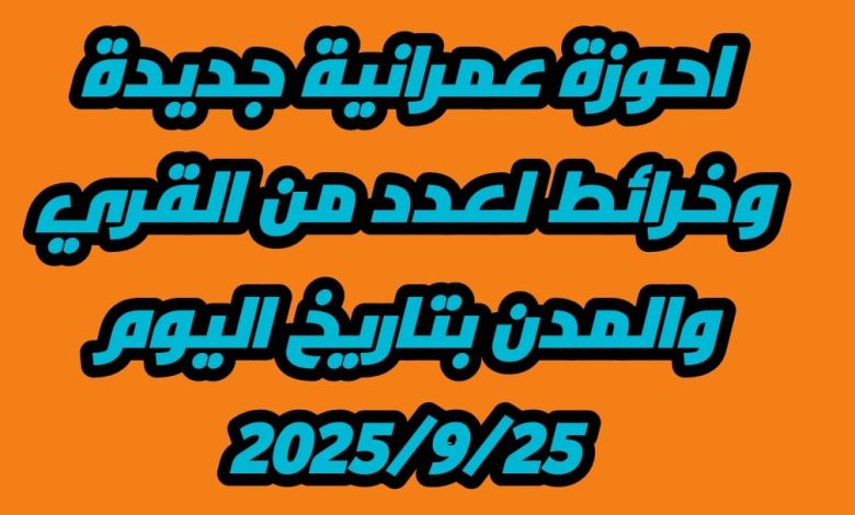 احوزة عمرانية جديدة وخرائط لعدد من القري والمدن بتاريخ اليوم 2025/9/25 – الحيز العمراني الجديد لمحافظة المنيا 2025 – الحيز العمراني الجديد لمحافظة القليوبية 2025 – الحيز العمراني الجديد لعدد 3 قري تابعة لمحافظة الشرقية 2025 – الحيز العمراني الجديد لمحافظة الشرقية 2025 – الحيز العمراني الجديد لمدينة الخانكة 2025 – خرائط الحيز العمراني الجديد 2025 – الحيز العمراني الجديد 2025